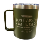 "Don't Austin My Texas" 14oz mug. Sleek tumbler in army green with a secure vacuum-sealed lid. No need to fear your Whiskey Morning Coffee making a mess with the convenient locking tab.
