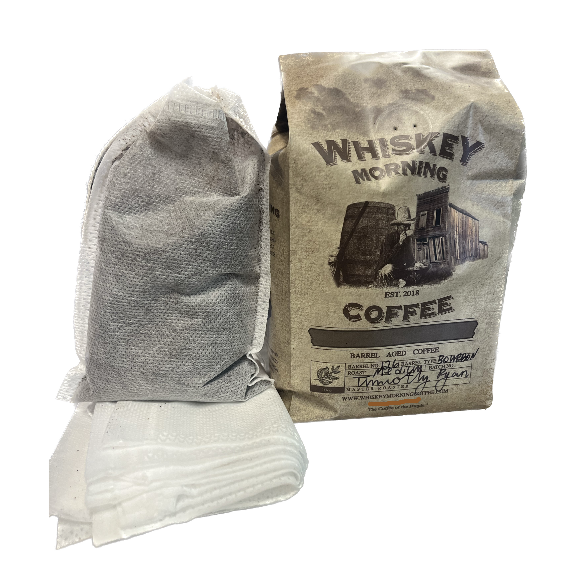 Bundle comes with 10 cold brew filter sacks and a bag of Barrel Aged Coffee.